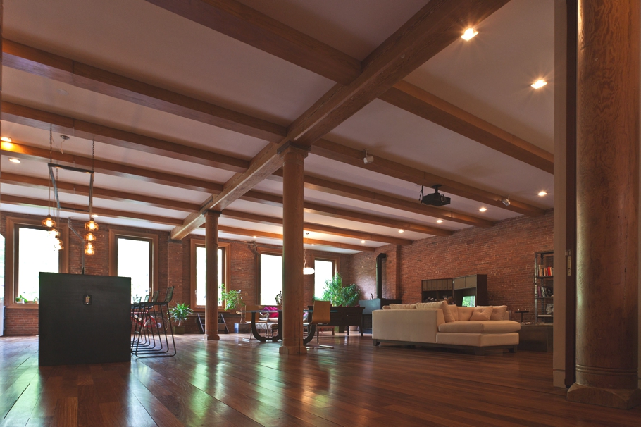 Опорные колоны из дерева считаются одними из самых стильных и оригинальных конструкций в этом интерьере. Также стоит сказать, что по всему пространству лофта можно видеть панели, которые изготовлены из красного натурального дерева, его по индивидуальному заказу доставили из Аргентины.